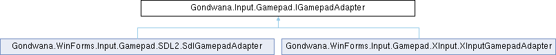 Implemented in Gondwana.WinForms.Input.Gamepad.SDL2.SdlGamepadAdapter, and Gondwana.WinForms.Input.Gamepad.XInput.XInputGamepadAdapter.